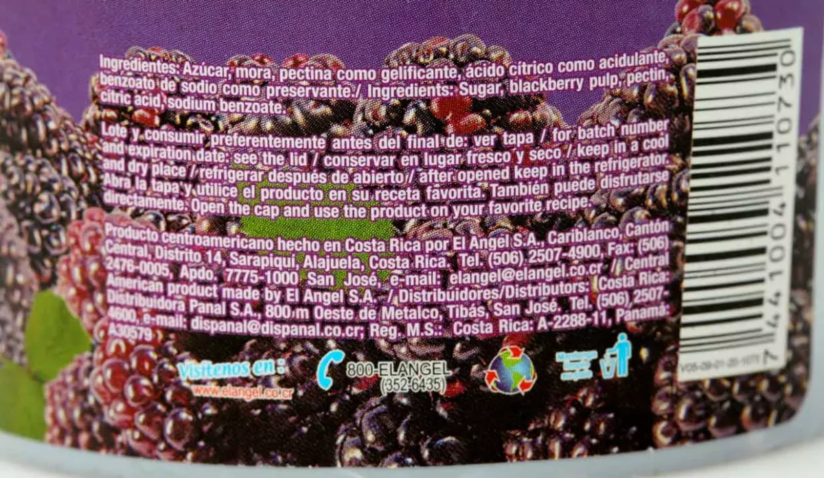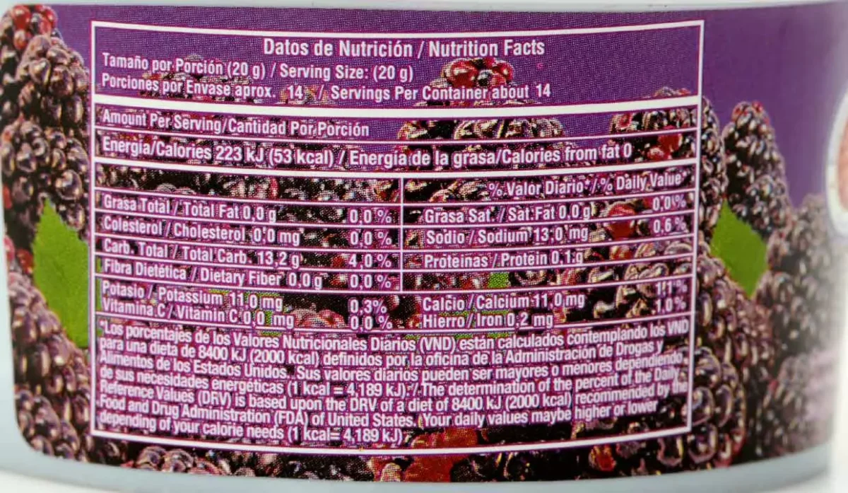 | Ingredientes | Azúcar, mora, pectina, ácido cítrico y benzoato de sodio |