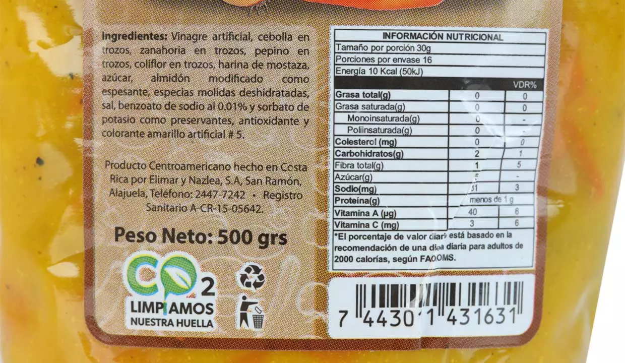 | Ingredientes | Vinagre artificial, cebolla, zanahoria, pepino, coliflor, harina de mostaza y azúcar |
