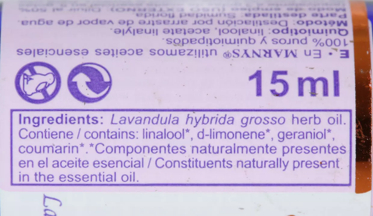 | Ingredientes | Lavandula, hybrida grosso herb oil, contiene linalool, d-limonene, geraniol, coumarin, componentes naturalmente presentes en el aceite esencial |