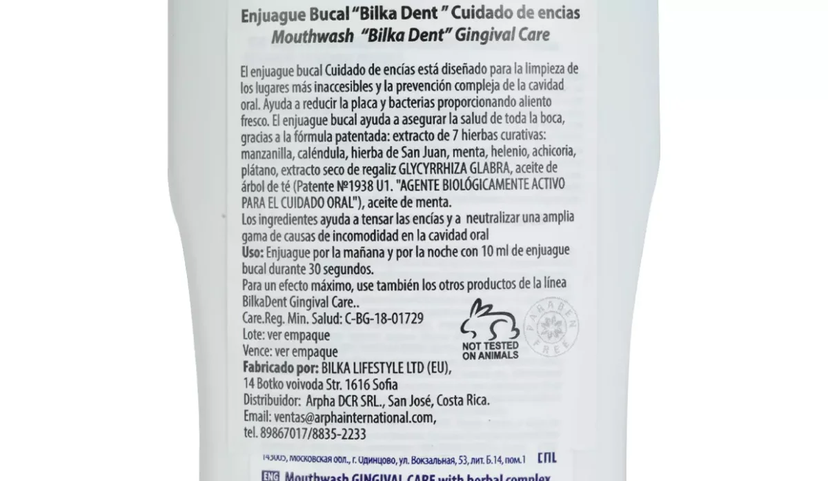 | Modo de Uso | Enjuagar por la mañana y por la noche con 10 ml de enjuague bucal durante 30 segundos |