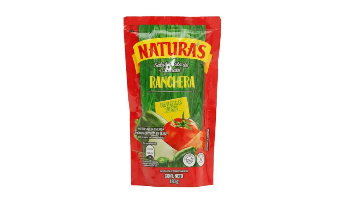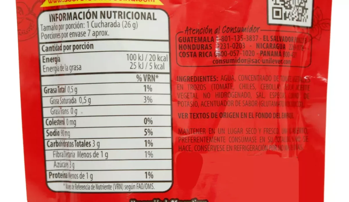 | Ingredientes | Agua, concentrado de tomate, vegetales en trozos (tomates, chiles, cebolla) azúcar, aceite vegetal no hidrogenado, sal, especias, cloruro de potasio, acentuador de sabor (glutamato monosódico) |