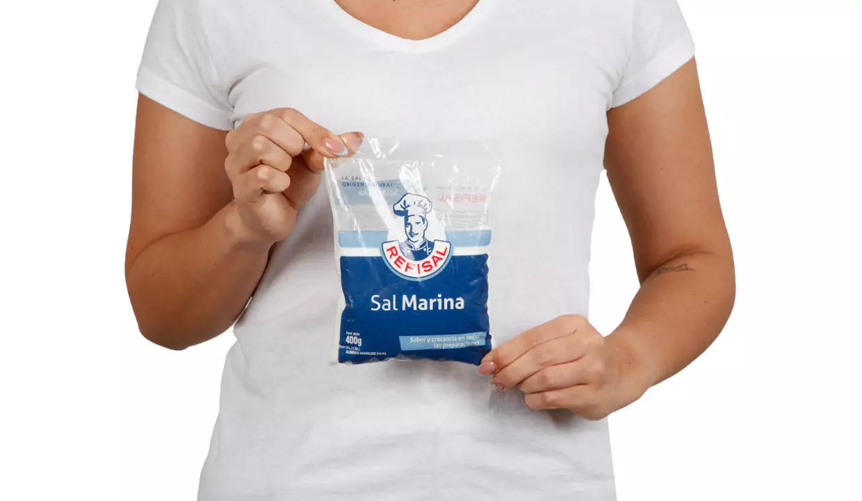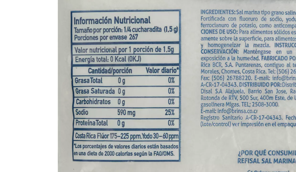 | Ingredientes | Sal marina tipo grano salino lavada y molida, fortificada con fluoruro de sodio, yoduro de potasio y ferrocianuro de potasio, como anticompactante |