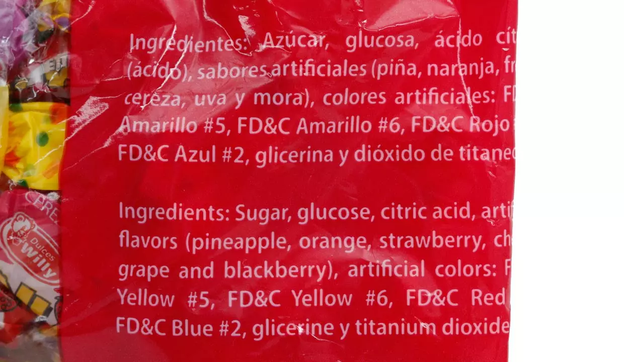 | Ingredientes | Azúcar, glucosa, ácido cítrico, sabores artificiales a piña, naranja, fresa, cereza, uva y mora, colores artificiales amarillo #5 y #6, rojo #40, azul #2, glicerina y dióxido de titaneo |