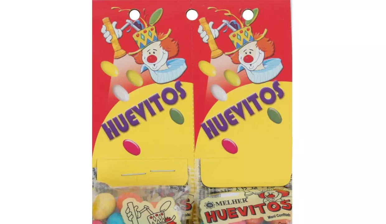 | Ingredientes | Azúcar, maní, cera camauba, talco simple. dióxido de titanio, cremor tártaro, amarillo N6, rojo N3, amarillo #5, azul N1 |