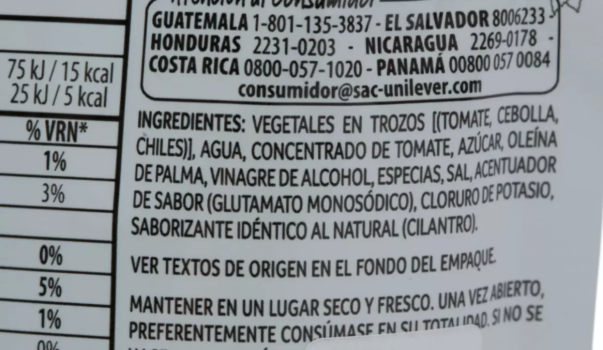 | Ingredientes | Vegetales en trozos (tomate, cebolla, chile), agua, concentrado de tomate, azúcar, oleína de palma, vinagre de alcohol, especias, sal, acentuador de sabor, gutamato monosódico, cloruro de potasio, saborizante idéntico al natural |