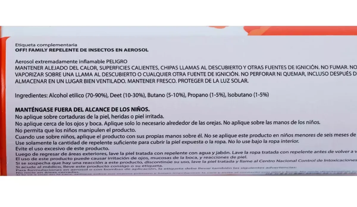 | Ingredientes | Alcohol etílico (70-90%), deet (10-30%), butano (5-10%), propano (1-5%), isobutano (1-5%) |