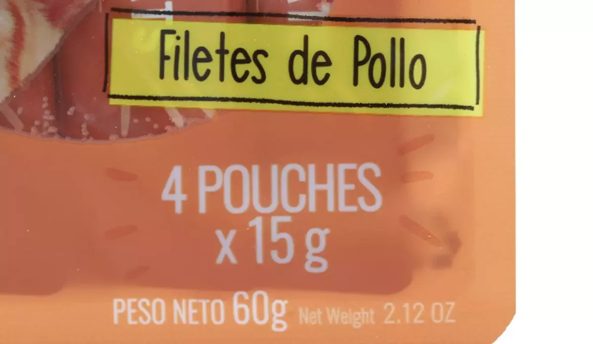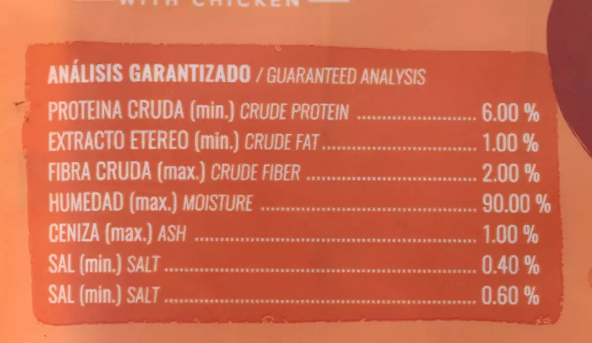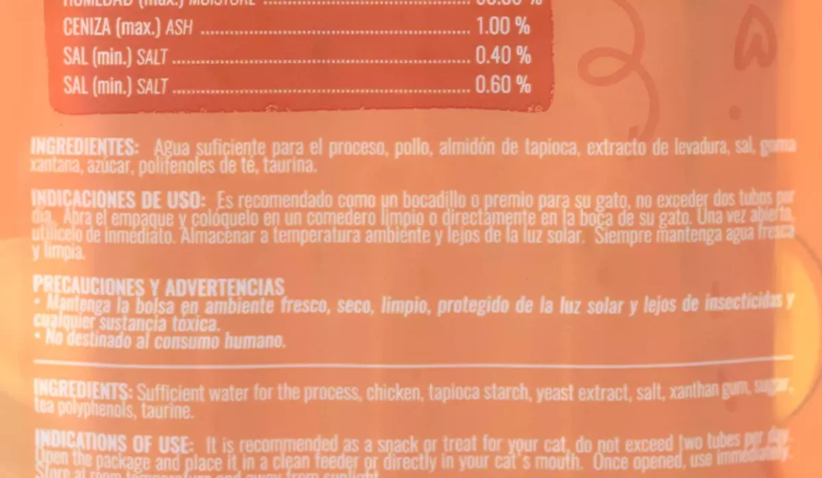 | Ingredientes | Agua suficiente para el proceso, pollo, almidón de tapioca, extracto de levadura, sal, goma xantana, azúcar, polifenoles de té, taurina |