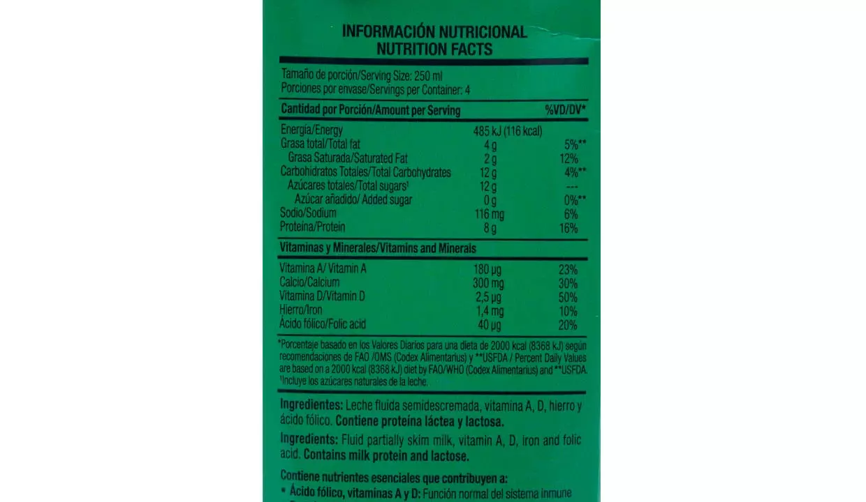 Ingredientes | Leche fluida semidescrmada: vitamina A,D, hierro y ácido fólico. Contiene proteína láctea y lactosa |