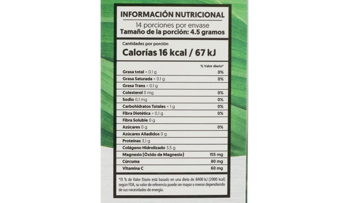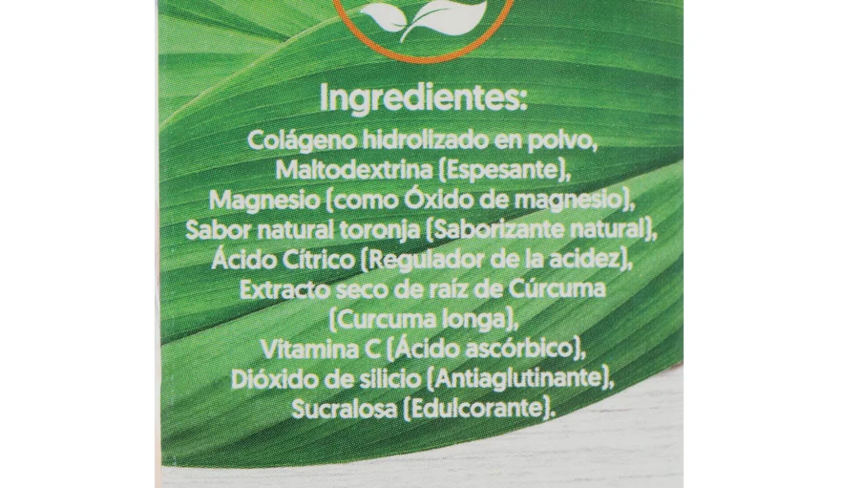 | Ingredientes | Colágeno hidrolizado en polvo, maltodextrina (espesante), magnesio (como óxido de magensio), sabor natural toronja (saborizante natural), ácido cítrico (regulador de acidez), extracto seco de raíz de cúrcuma (curcuma longa), vitamina C (ácido ascórbico), dióxido de silicio (antiaglutinante), sucralosa (edulcorante) |