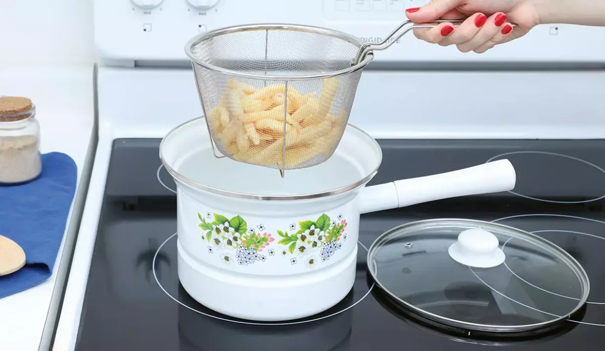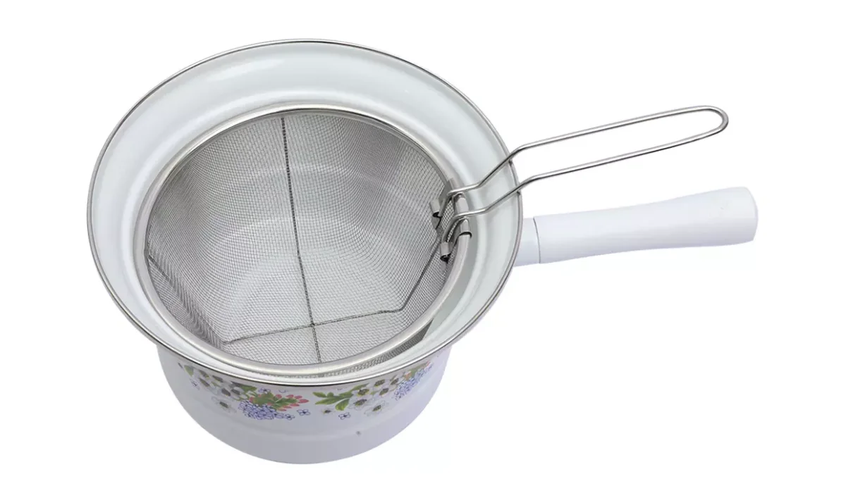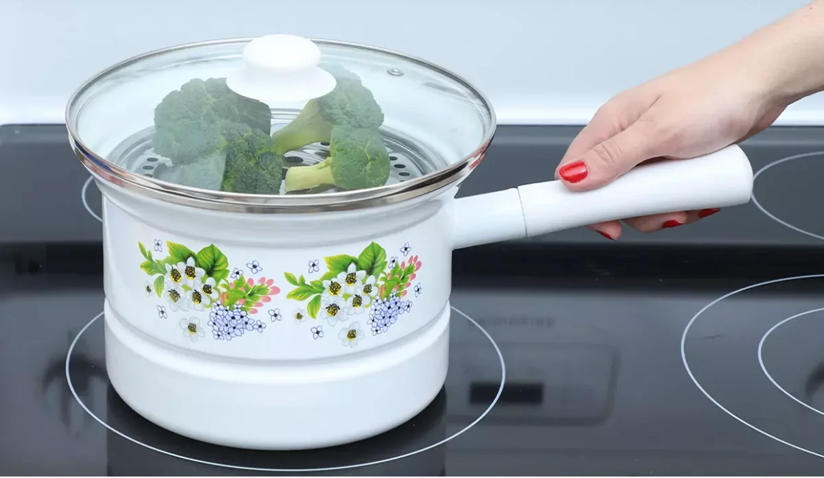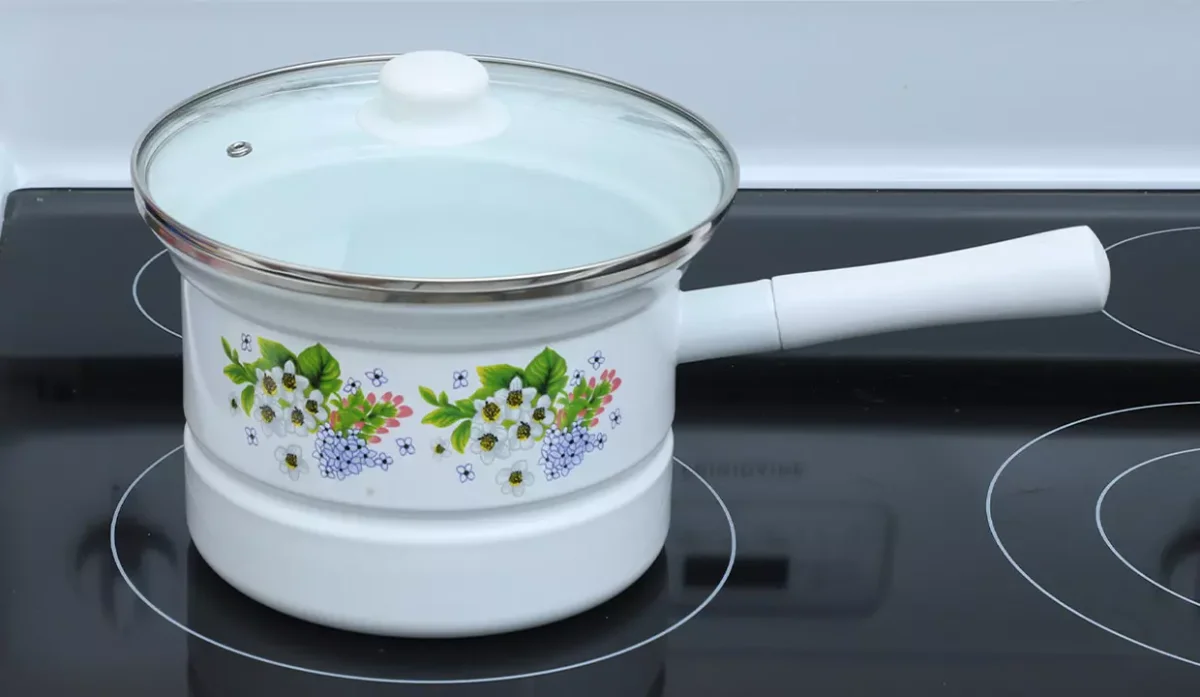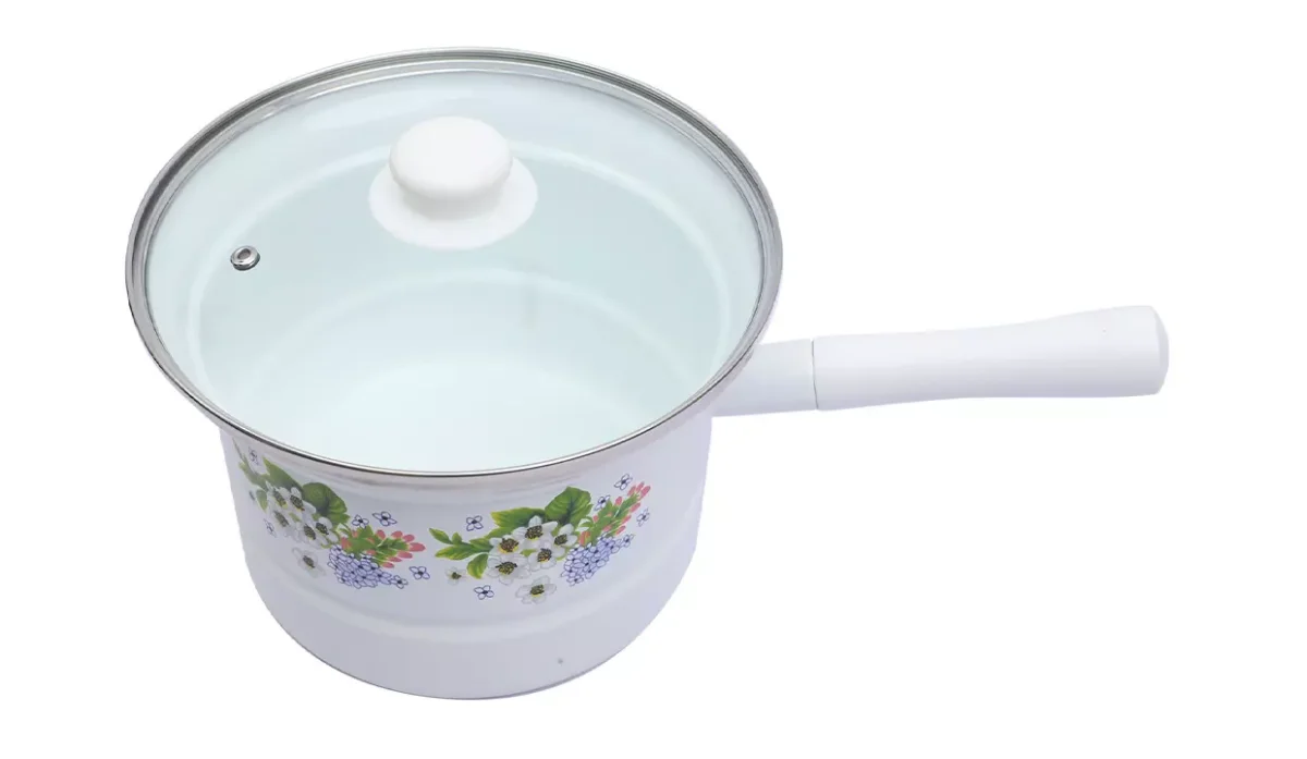 | Material | Acero de carbono con pintura esmaltada, tapa de vidrio y mango de madera |