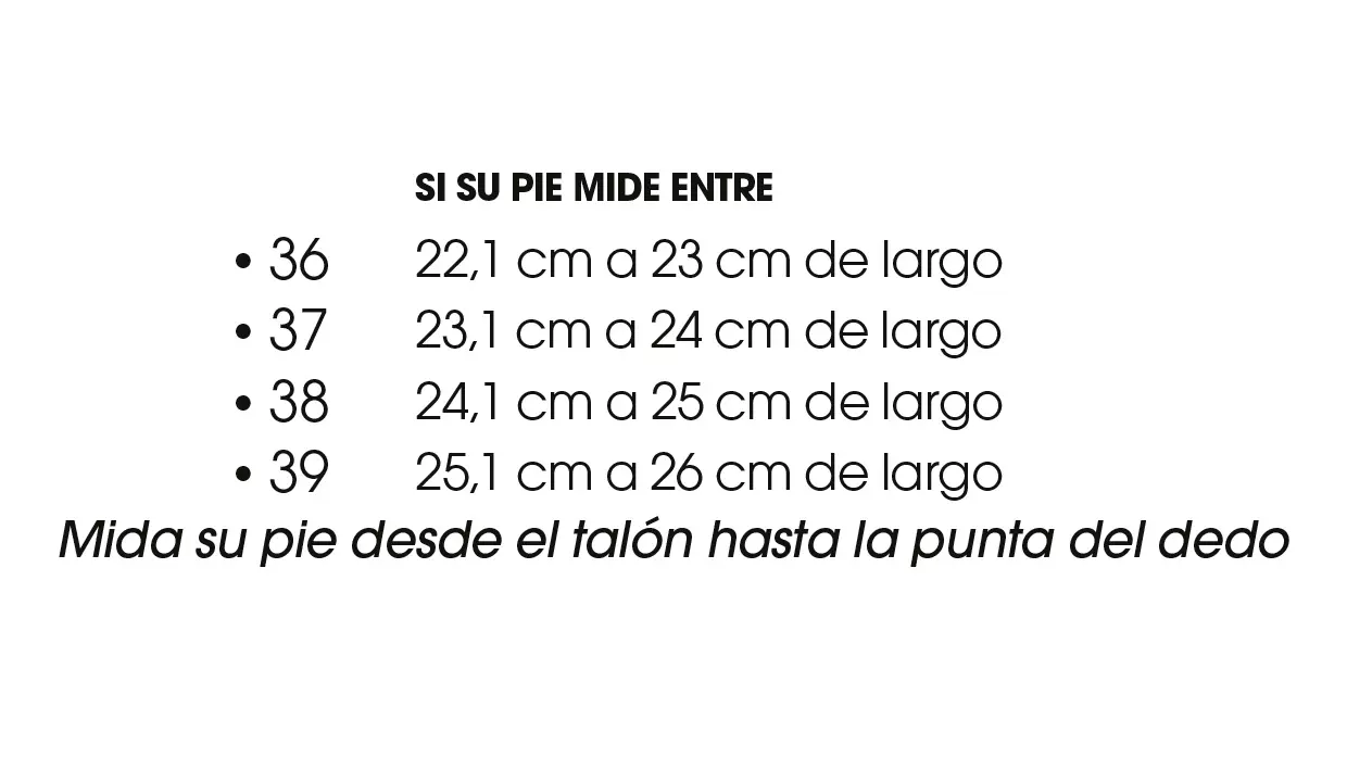 | Tamaño | Si su pie mide entre 22,1 cm a 23 cm de largo |