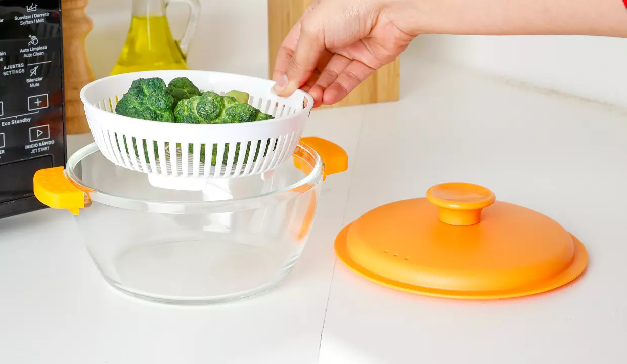 Material | Vidrio refractario, tapa plástica, agarraderas de silicón y canasta plástica |